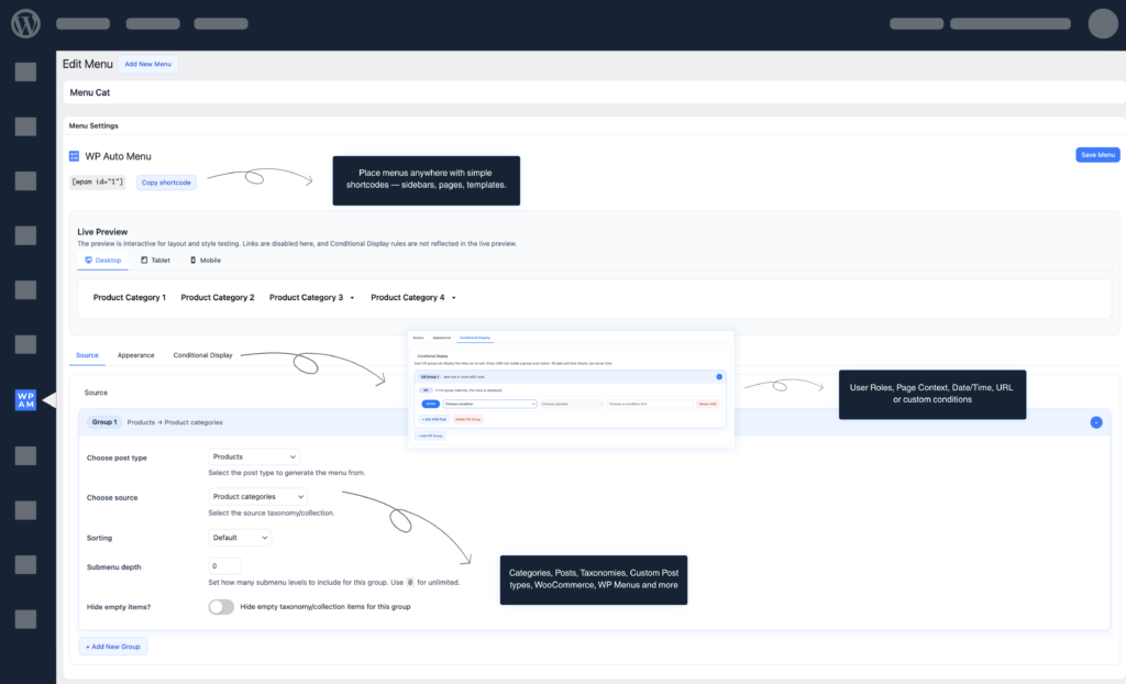 Place menus anywhere with simple shortcodes — sidebars, pages, templates.
